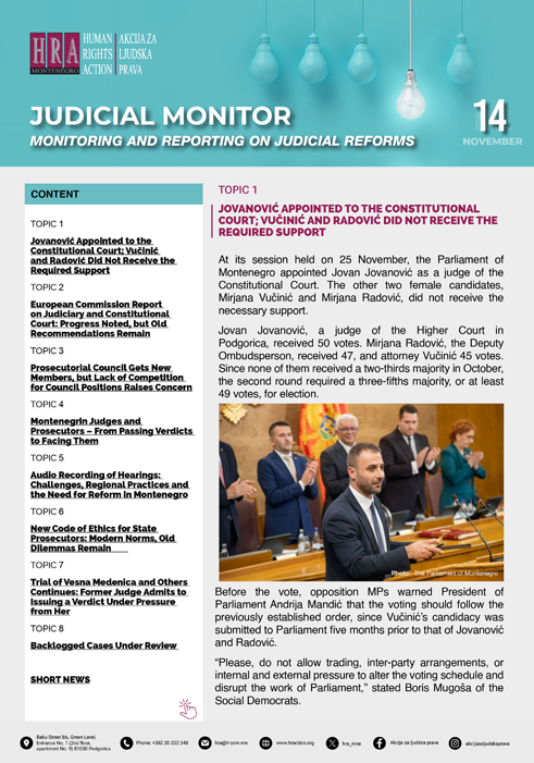 The Human Rights Action (HRA) welcomes the election of one Constitutional Court judge, Jovan Jovanović, but expresses regret over the failure to elect the proposed candidates […]