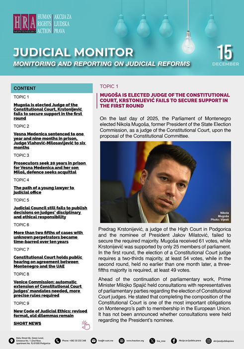 HRA NEWSLETTER 15 – TOPIC 1 On the last day of 2025, the Parliament of Montenegro elected Nikola Mugoša, former President of the State Election Commission, […]