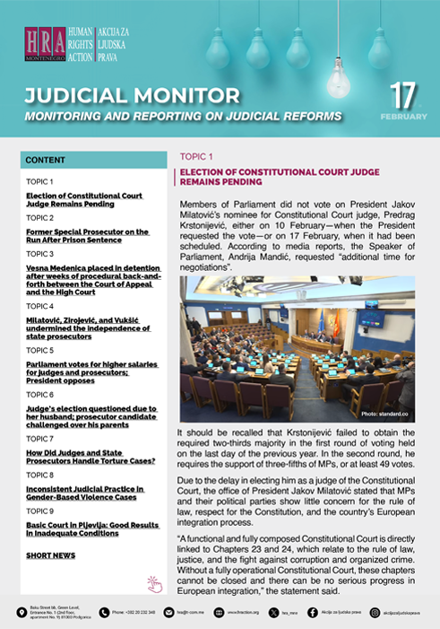 HRA NEWSLETTER 17 – TOPIC 1 Members of Parliament did not vote on President Jakov Milatović’s nominee for Constitutional Court judge, Predrag Krstonijević, either on 10 […]